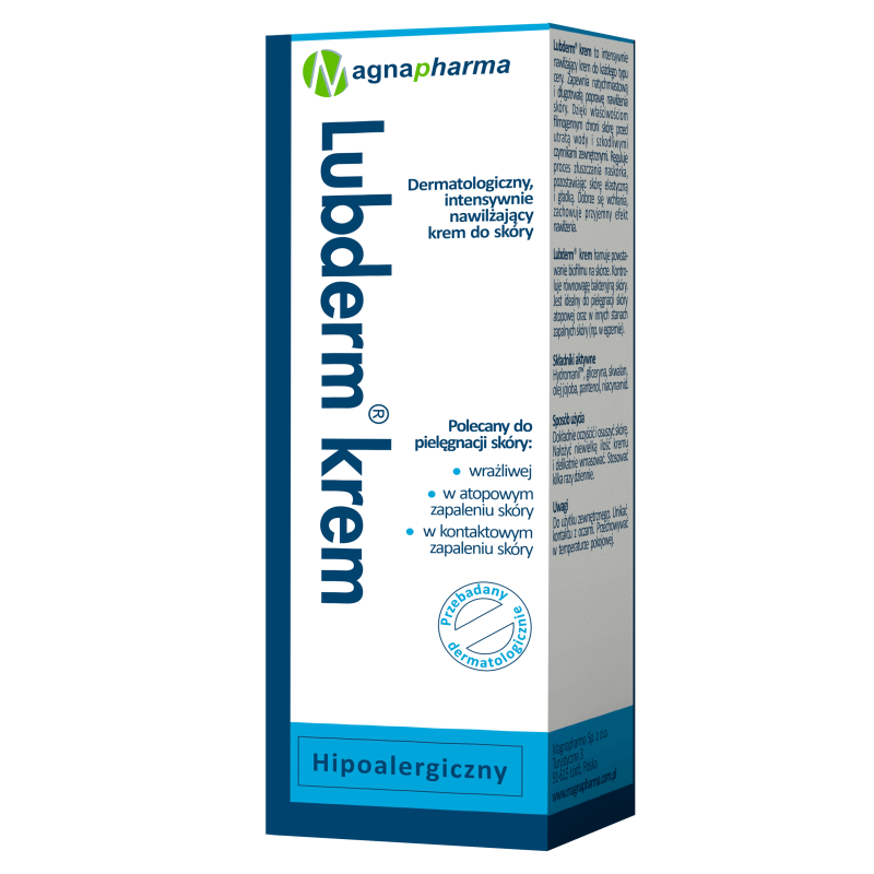 Lubderm® krem to intensywnie nawilżający krem do każdego typu cery.Zapewnia natychmiastową i długotrwałą poprawę nawilżenia skóry. Dzięki właściwościom filmogennym chroni skórę przed utratą wody i szkodliwymi czynnikami zewnętrznymi. Reguluje proces złuszczania naskórka,pozostawiając skórę elastyczną i gładką. Dobrze się wchłania, zachowuje przyjemny efekt nawilżenia.